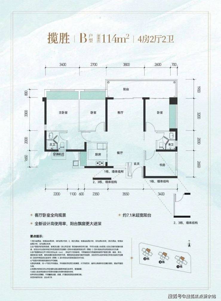 114㎡的4房2厅2卫,设计的是竖厅双龙抱珠格局,进门入户玄关,客厅3.8米的开间,LDKB一体化设计,4个卧室分别做到了3.4米/2.7米/2.6米/2.65米的宽度,客厅连接次卧出7米长的观景大阳台,U型厨房,得房率约:81.39%(不含赠送),东北朝向看科学公园。