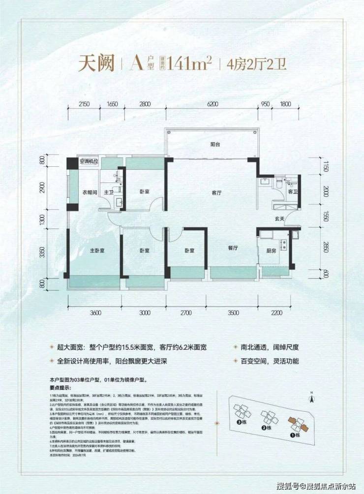 141㎡的4房2厅2卫,设计的是横厅南北通透格局,进门入户玄关,超宽客厅6.2米的开间,五开间朝南,4个卧室分别做到了3.6米/3米/2.8米/2.7米的宽度,主卧大套房设计,U型厨房,公卫三段式分离设计,得房率约:81.4%(不含赠送),阳台主朝东北向,看科学公园景观。
