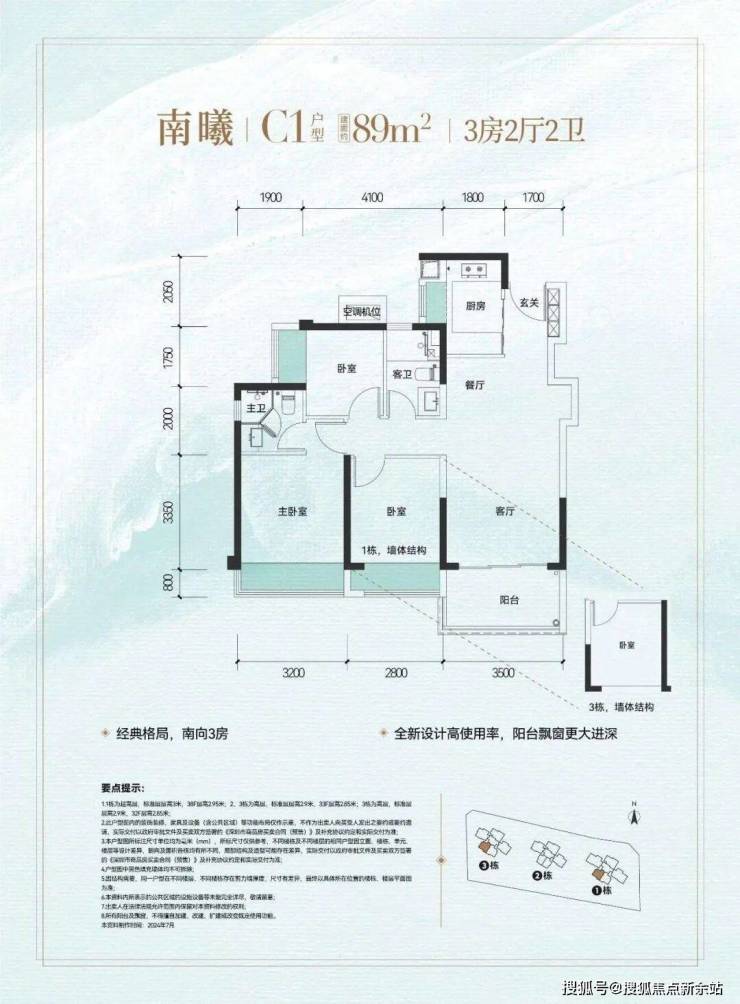 89㎡的3房2厅2卫(C1户型),设计的是经典竖厅格局,进门入户玄关,客厅3.5米开间,S墙设计预留冰箱卡槽位,三开间朝南,3个卧室分别做到了3.2米/2.8米/2.35米的宽度,U型厨房,卫生间干湿分离,得房率约:81.39%(不含赠送),西南朝向。