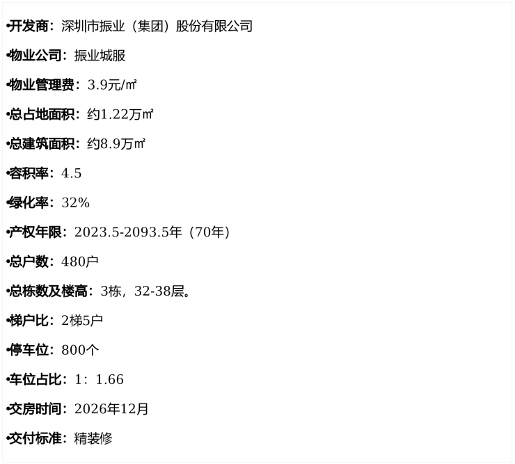 振业天境云庭,由深圳国企振业集团打造,总占地面积约1.22万㎡,总建筑面积约8.9万㎡,计容建筑面积约5.8万㎡,容积率4.5,绿化率32%,共由3栋总高32-38层高的住宅组成,其中1栋住宅38F,2栋住宅33F,3栋住宅32F。