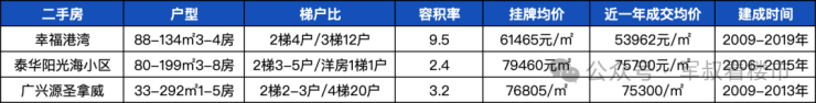 二手房方面,近一年成交量区域top3的「幸福港湾」和「泰华阳光海小区」、「广兴源圣拿威」,近一年成交均价在约5.4-7.5万/㎡之间,挂牌价在6.1-8万/㎡之间,可以看出容积率越低,价格越高。