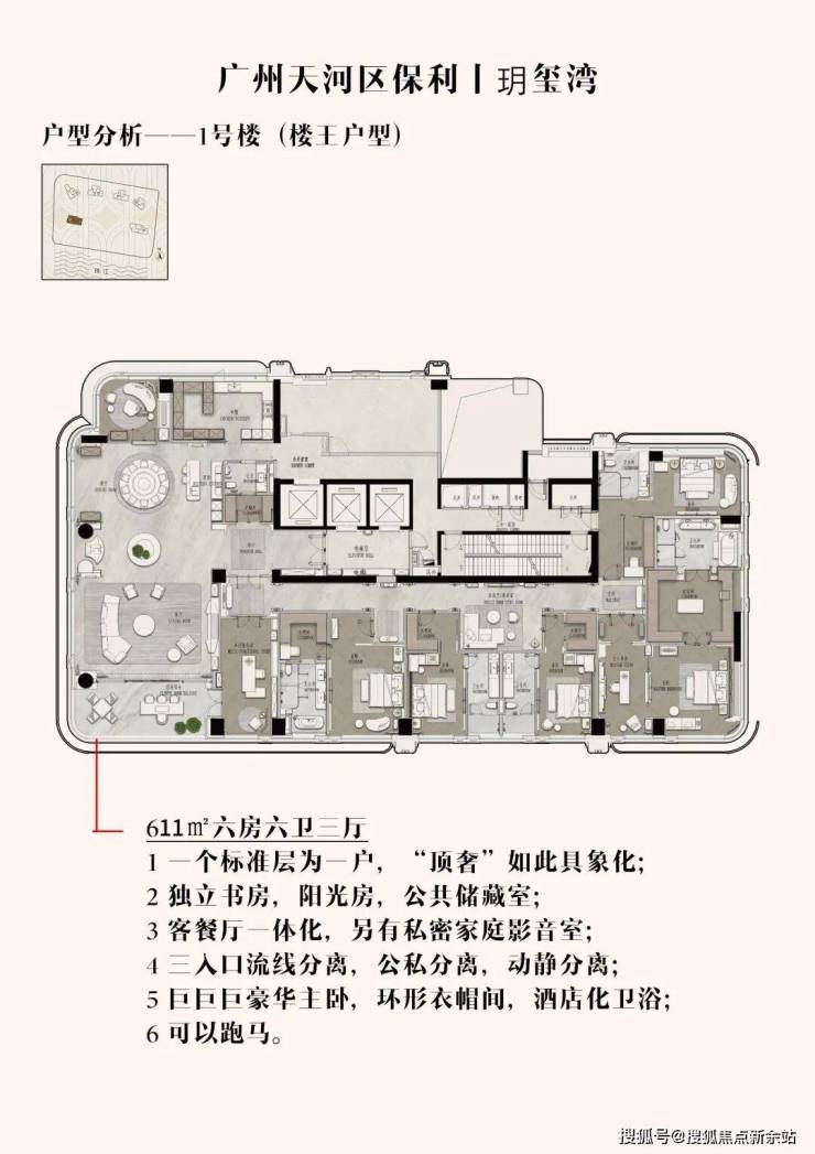 项目1号楼611㎡楼王户型套均售价约一个亿起步,楼王户型均价在18万左右/㎡,一层一户的设计让每一户都能拥有270°的环幕江景视野,整个1号楼611㎡的楼王产品也仅有30套稀缺单位可售,注定将会颠覆广州顶豪市场非常抢手!