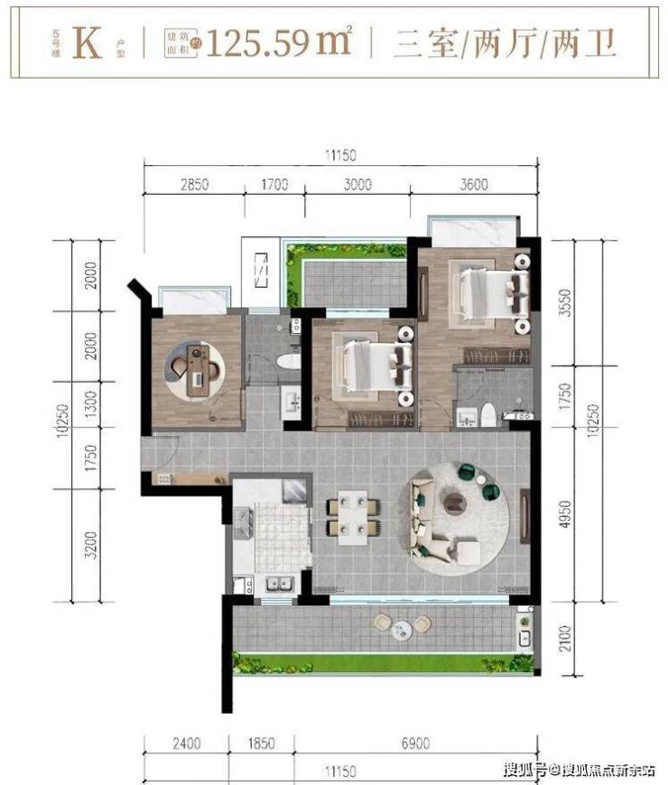 ✨5楼K户型约125㎡三房两厅两卫