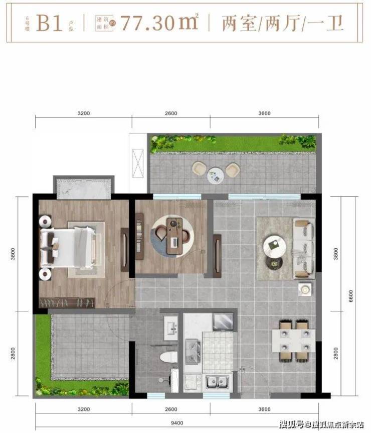 ✨ 6楼B1户型约77㎡舒适两房两厅一卫