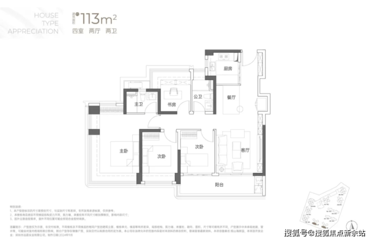 108-110㎡4房2卫户型:为西南向或东南向,竖庭设计,南北通透,阳台也是连通到次卧对出,比较宽敞。