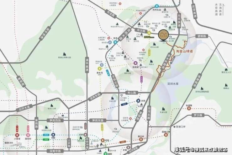 约200米直线距离到淘金山绿道,沿线共13个景观节点,起于翠湖社区公园,终至沙湾路,分为映彩华章、山林野趣、山湖叠翠和绿廊揽胜四个主题段,可俯揽深圳水库、远眺梧桐山。近邻求水山公园、樟树布公园,举步自然的浓荫谧静,成为家人休闲栖息目的地。