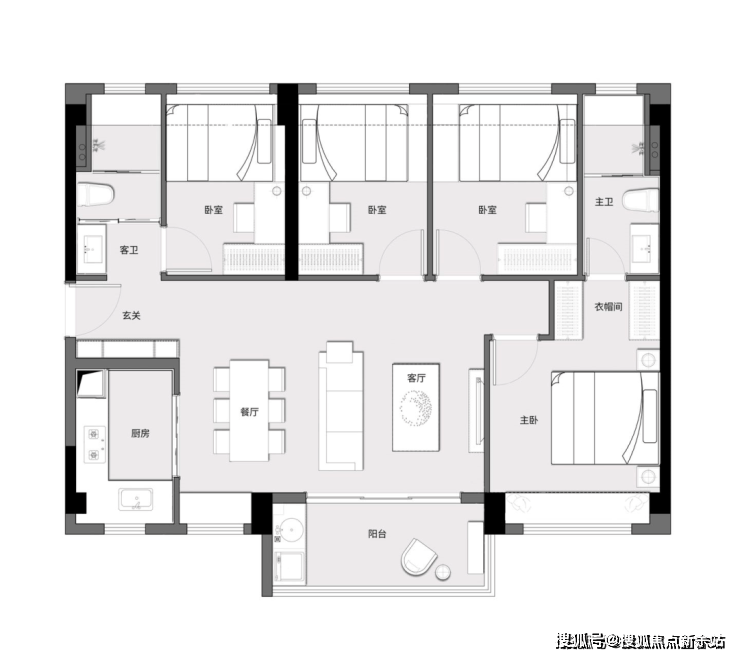 户型方正通透,全南向布局;客餐厅一体化;卧室全飘窗,雅致通透;贴心工卫设计、干湿分离