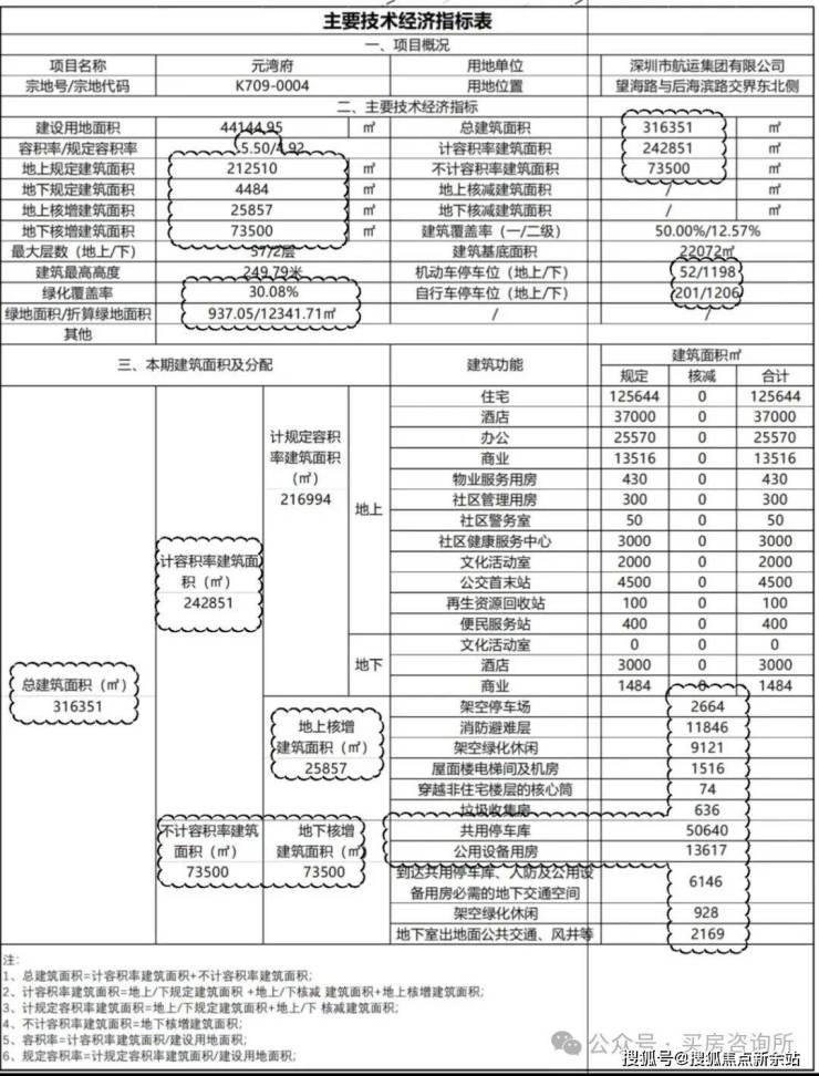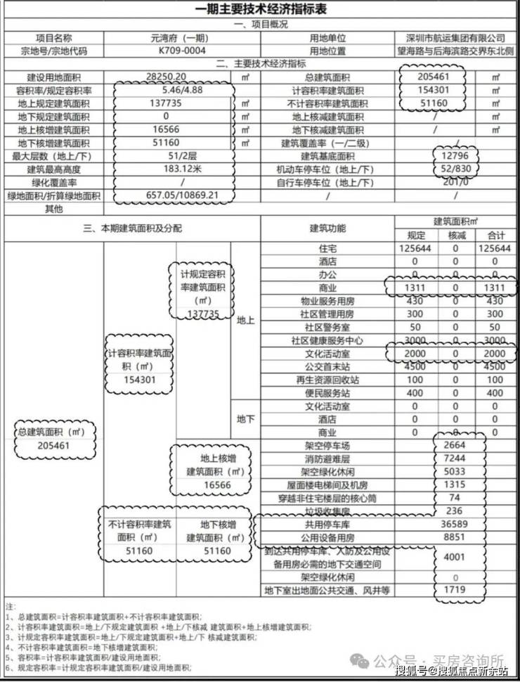一期指标表修改:总建筑面积由207205平方米调整为205461平方米,计容积率建筑面积由156113平方米调整为154301平方米,容积率由5.53调整为5.46;计规定容积率建筑面积由137577平方米调整为137735平方米,其中商业面积由3153平方米调整为1311平方米,文化活动室由0平方米调整为2000平方米;地上核增建筑面积由18536平方米调整为16566平方米,地下核增建筑面积由51092平方米调整为51160平方米;建筑总高度及层数由54/2层、192.42米调整为51/2层、183.12米;建筑基底面积由11803平方米调整为12796平方米。总指标表相应修改。