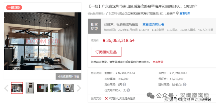 无敌看海的住宅中信元湾府,隔壁一路之隔翡翠海岸都卖20万的二手房,11月5日,翡翠海岸一套177平的法拍房有21名客户参与竞拍,加价219次,最终以3606.3万成交,成交单价20.4万/平,比起拍价高出1909.5万。