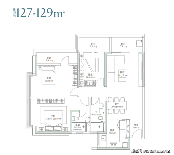 竖厅户型,客餐厅一体出阳台,客厅旁边“阳台”实际可以做一个房间,主卧套房设计,也可以做成5房。