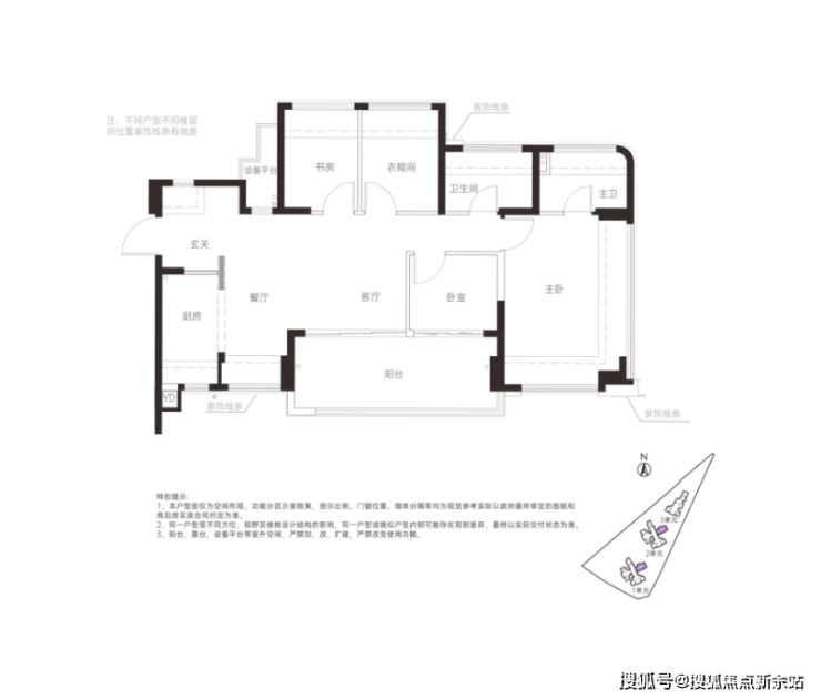 横厅设计,入户玄关处可以做收纳,全屋多飘窗,主卧套房设计,“阳台”和“书房”处实际可以做房间。