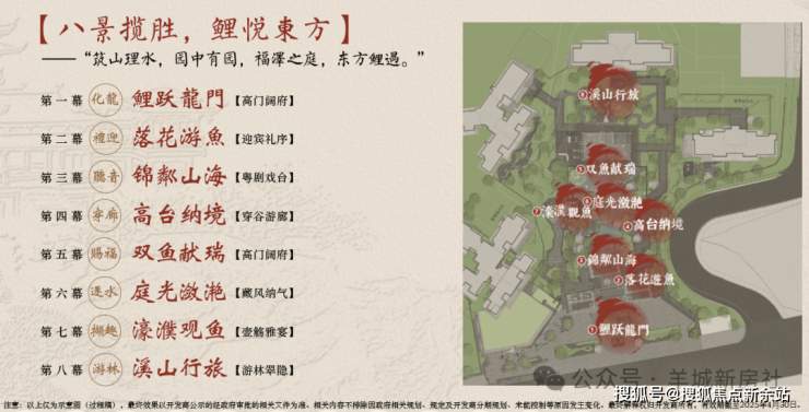 项目以“锦绣八景”为主题,融合岭南四大名园(梁园)造园精髓,打造“可行可望可游可居”的东方山水隐园: