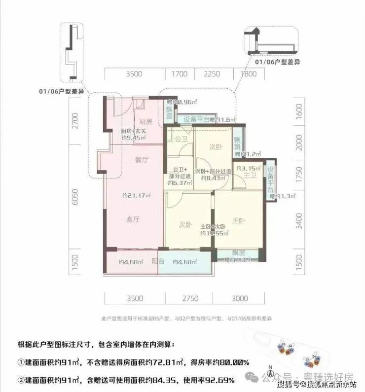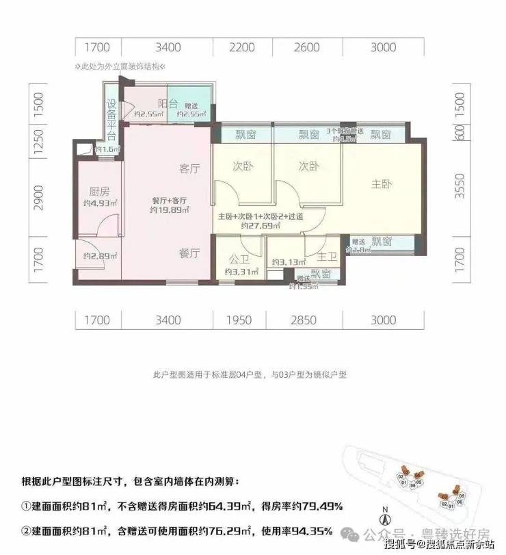 81㎡的3房2厅2卫,设计的是竖厅南北通透格局,客厅3.4米开间,3个卧室分别是3米/2.6米/2.2米的宽度,L型厨房,得房率:94.35%(包含赠送),阳台西北或东北朝向。