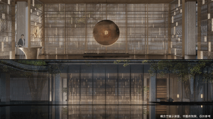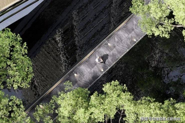 入口以对称柱廊与静水庭院构建庄重仪式感。柱廊挺拔,静水映天,归家第一步,从容而沉静。中心的下沉镜面水院,纳绿植、光影与建筑于一体,凝练为现代东方的水墨长卷,静谧中见深意。三层空中花园,以浮岛廊架、亲水乐园勾勒出全龄社交场。这里充满笑语与生机,是家庭休闲与邻里互动的理想之境。
