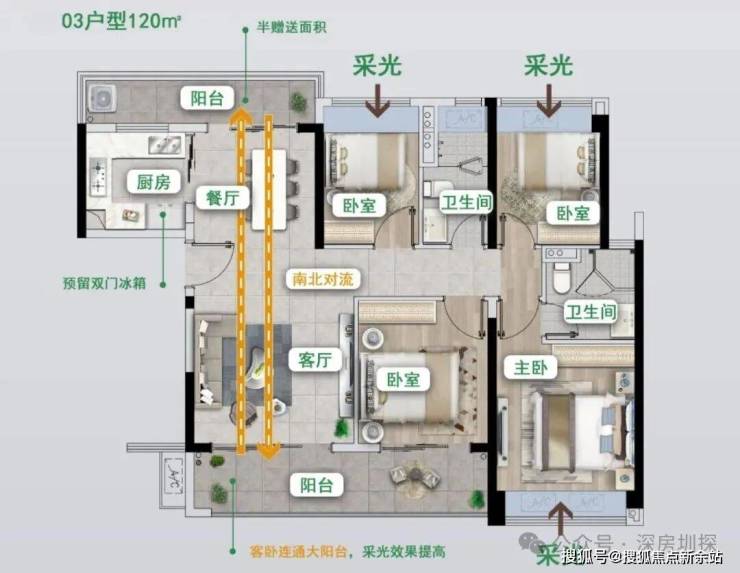 120㎡雙陽台南北對流,四房兩廳兩衛