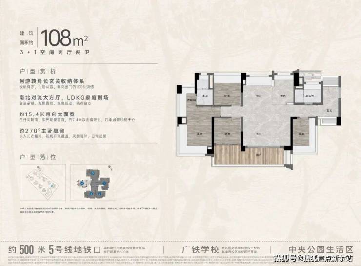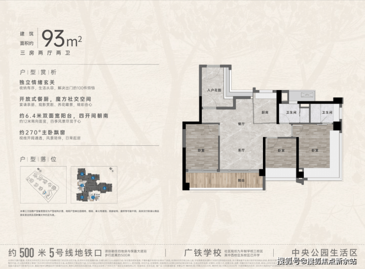 “中央公园”,紧邻大脚印公园,距离地铁约500米,紧邻学校、酒店,户型涵盖75-88㎡三房,105、125、142㎡四房。
