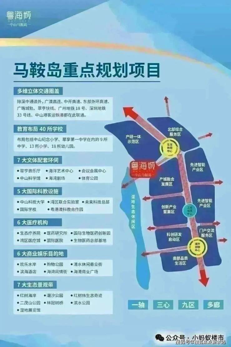 规划显示,马鞍岛将打造为 “国际化、现代化、创新型城市新中心” ,规划建设40所学校、7所医院、13个生态公园和6大商业集群。随着中山科技大学选址翠亨新区,医疗城、生物医药总部基地等高端配套相继落地,区域价值正迎来爆发前夜。