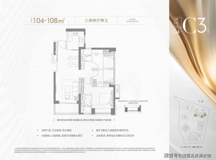 104-108㎡的4房2厅2卫,设计的是竖厅格局,进门入户玄关,客厅3.6米开间,LDKB一体化设计,进深8.7米,S墙设计预留冰箱卡槽位,三开间朝南,主卧套房设计,U型厨房,公卫三段式分离,得房率约72.45%(不含赠送),正南或正东朝向。