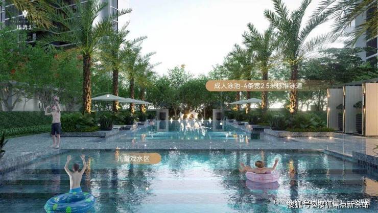 值得一提的是,一条漂浮感的小径将泳池分为儿童池和成人池,隔而未隔界而未界,大人小孩分开自在畅游,更具可游性。