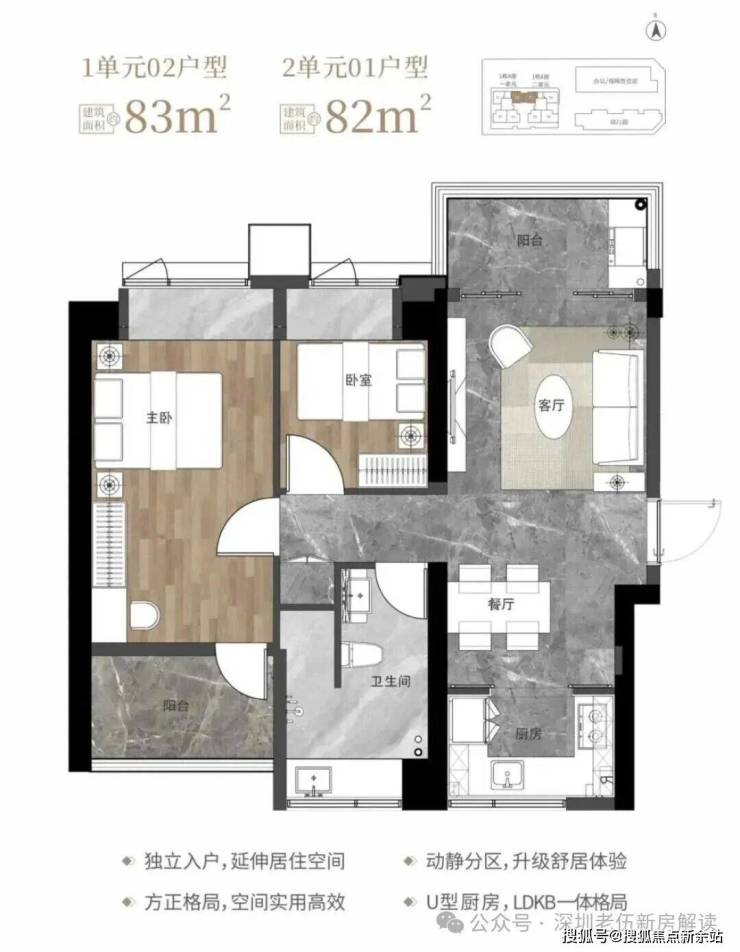 82-83㎡的3房2厅1卫,1栋1单元02户型/1栋2单元01户型,设计的是竖厅南北通透格局,独立入户,客厅3.2米开间,LDKB一体化设计,动静分区,南北双阳台,U型厨房,卫生间干湿分离,阳台正北朝向。