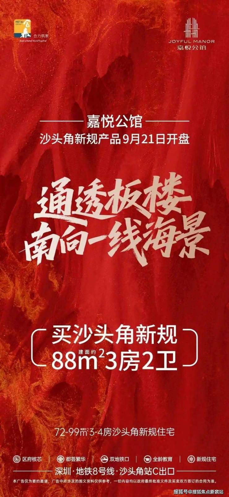 深圳合泰·嘉悦公馆位于盐田沙头角,近地铁8号线沙头角站。背靠梧桐山,南眺大鹏湾,景观优越。户型为72-99㎡三至四房,新规住宅得房率高,周边教育、商业配套完善,是刚需与改善型购房者的优质选择。