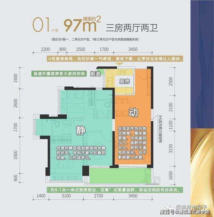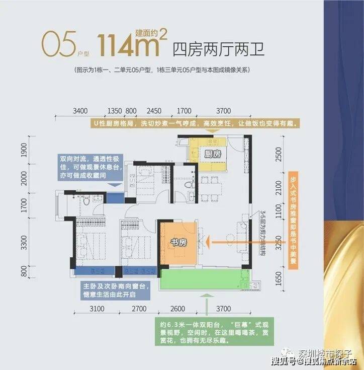 ②满足父母同住、亲子互动、高效收纳、圈层社交等多维需求;采光明亮,户型通透,面宽约 6.9m,进深 1.95m 一体双阳台;结合飘窗设计的 U 型厨房,双开门冰箱位;四开间朝南户型方正、动静分离;主卧套间设计,双床头柜+梳妆台配置,双边上下床;