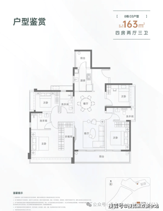 163㎡的4房2厅3卫,设计的是竖厅格局,一梯一户,进门入户玄关,LDKB一体化设计,三开间朝南,双主卧套房,客厅连接次卧出大阳台,L型厨房还带1个生活阳台,卫生间干湿分离,得房率约82%(不含赠送),东南朝向。