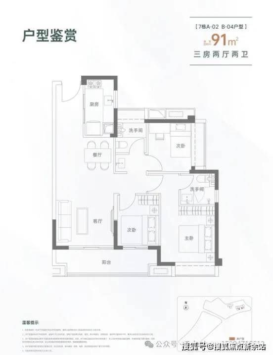 91㎡的3房2厅2卫,设计的是经典竖厅格局,进门入户玄关,LDKB一体化设计,三开间朝南,动静分区,客厅连接次卧出大阳台,L型厨房,公卫三段式分离,得房率约82%(不含赠送),东南朝向。