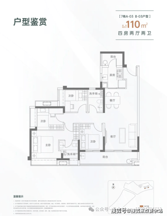 110㎡的4房2厅2卫,设计的是经典竖厅格局,进门入户玄关,LDKB一体化设计,四开间朝南,动静分区,客厅连接次卧出大阳台,L型厨房还带1个生活阳台,卫生间干湿分离,得房率约82%(不含赠送),东南朝向。