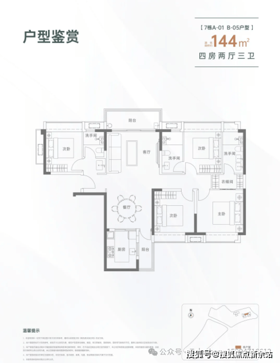 144㎡的4房2厅3卫,设计的是竖厅南北通透格局,进门入户玄关,LDKB一体化设计,双主卧套房,L型厨房还带1个生活阳台,公卫干湿分离,得房率约82%(不含赠送),阳台主朝西北向。