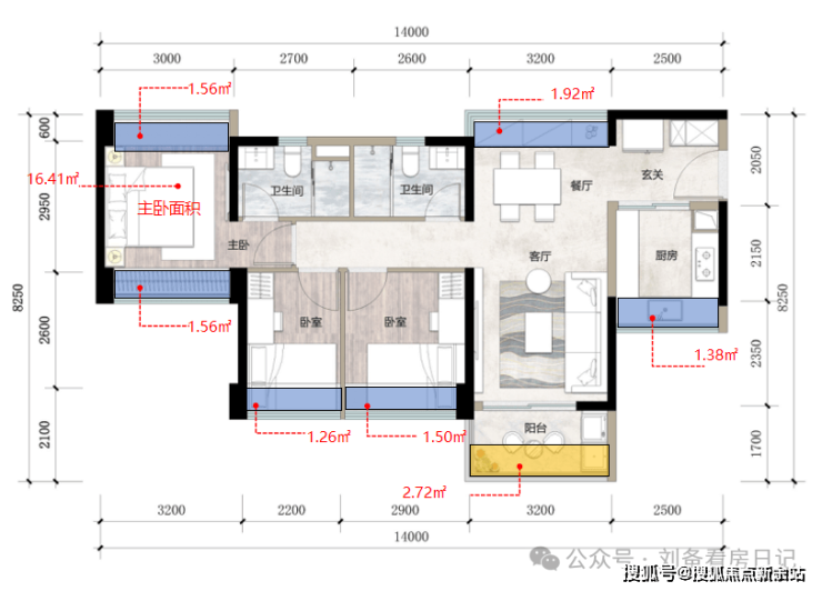建面约81㎡户型,额外可使用面积合计约9.86㎡:飘窗部分额外可使用面积约7.14㎡,阳台部分额外可使用面积约2.72㎡