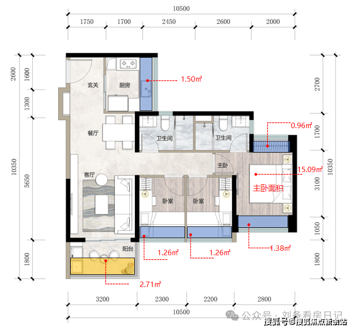 建面约88㎡户型,额外可使用面积合计约13.04㎡:飘窗部分额外可使用面积约10.32㎡,阳台部分额外可使用面积约2.72㎡
