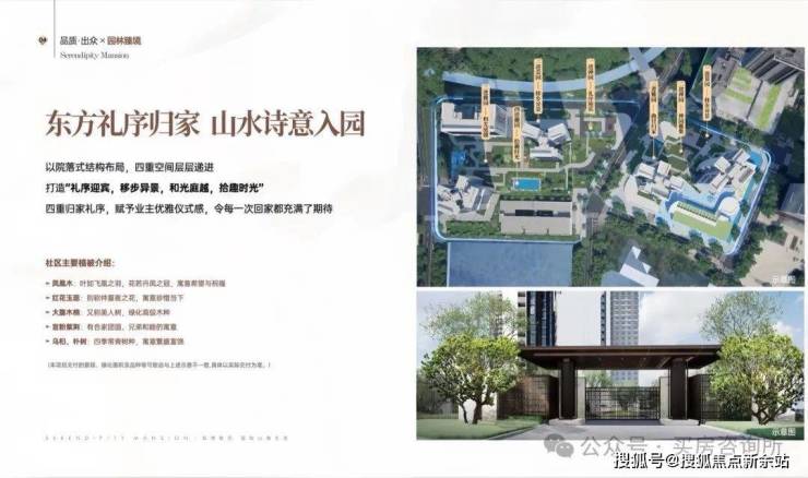 打造“礼序迎宾、移步异景、和光庭越、拾趣时光”四重归家礼序;科学正统围合式布局,营造社区生活第二中心