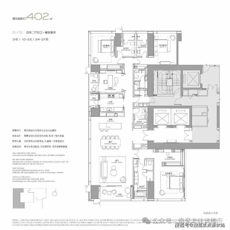 【户型规划】由4栋51至63层3.6-3.9米层高的纯居住奢装交付地标、两栋4.5米层高的小高层,35栋独栋,全景幕墙、宽景阳台。