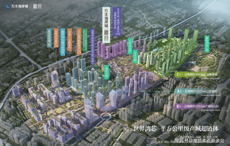 万丰区域整体城市更新项目包含A、B、C三区,合计总建面超500万平,包含商业、住宅、产业、甲级写字楼、高端酒店、学校教育、文化休闲、交通枢纽、生态公园等全维业态。