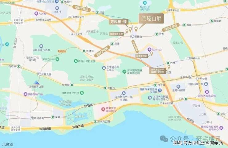 项目所在香蜜湖片区,周边倚靠安托山、塘朗山,与香蜜湖为邻,公园环簇安托山博物公园、梅林山公园、香蜜公园、园博园、儿童公园、燕晗山公园等。以两山一湖六公园的生态格局,拥揽城市绿肺。