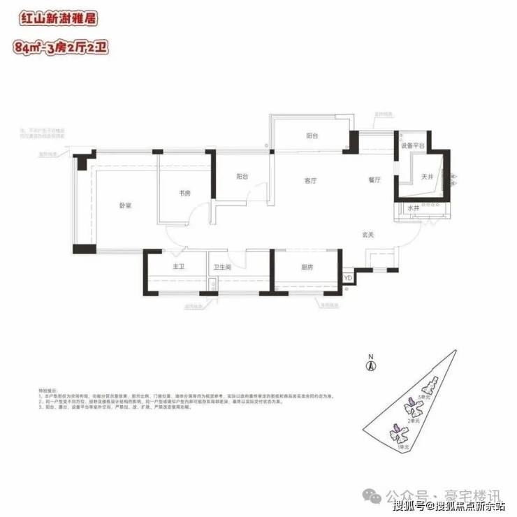 84㎡的3房2厅2卫,设计的是横厅南北通透格局,客厅3.4米开间,LDKG+X空间一体化,动静分区,主卧南北通设计,餐厅位带1个设备平台,U型厨房,卫生间干湿分离,得房率:100%(包含赠送),阳台东北朝向。