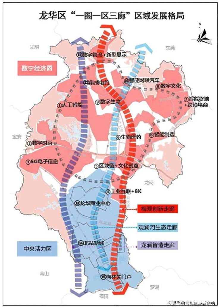 根据《龙华区城市更新和土地整备“十四五”规划》,构建“一圈一区三廊”空间格局,北部打造全球万亿级数字经济圈,南部打造深圳中央活力区,打造纵贯南北的三大都市走廊(梅观创新走廊、观澜河生态走廊、龙澜智造走廊);同时,提及提升北站国际商务区、龙华国际商圈重点片区发展能级。