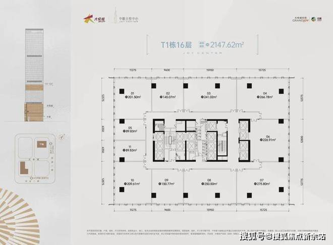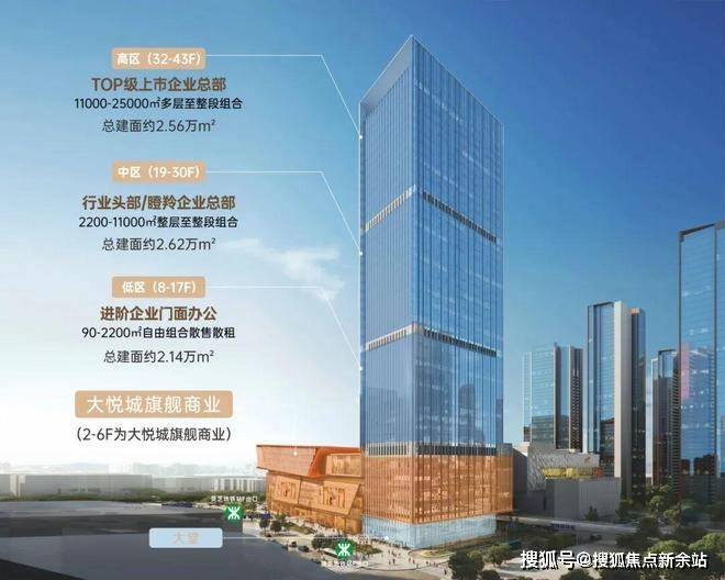 【楼栋信息】:大悦中心T1,城市之光,高度88米,共20层,总建筑面积约3万㎡,在售户型建面约:267-316㎡,6梯6户,标准层高约4.2米。