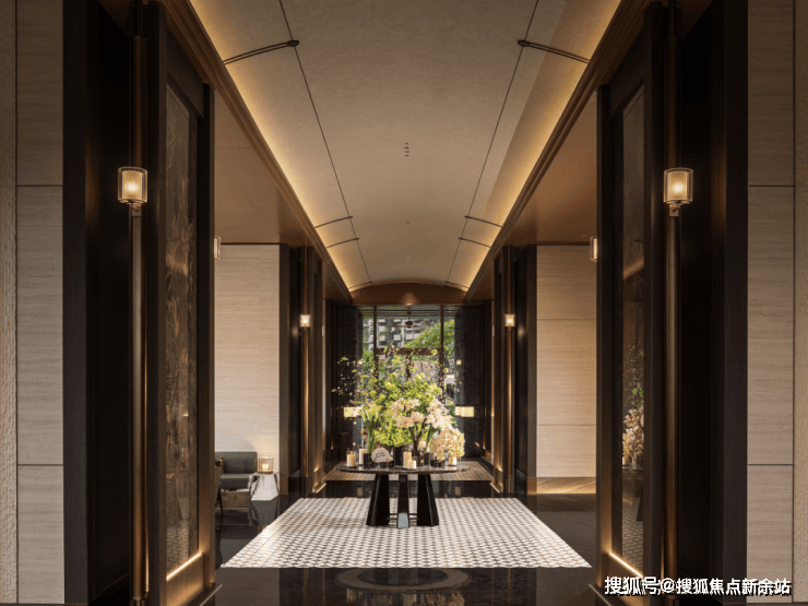酒店式社区大堂:朝向广场,入口前场、门廊、大堂、内庭院、单元大堂组成的归家动线,配合建筑、景观、室内、标识、灯光一体化设计,汲取糅合后的南洋文化元素细节,把酒店式归家仪式感拉满,彰显非凡气度。