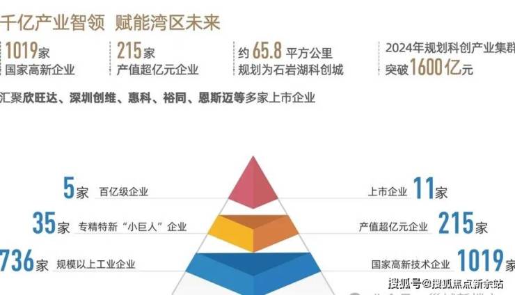 石岩科创城(规划面积65.8万平方公里)汇聚高端科技资源,驱动产业升级,形成产业集群效应,成为推动区域经济高质量发展的关键引擎。在2024年已汇集超过1019家国家高新技术企业,拥有215家产值超亿元企业,已汇聚欣旺达、深圳创维、惠科、裕同、恩斯迈等11家上市企业,规划科创产业集群突破1600亿元。