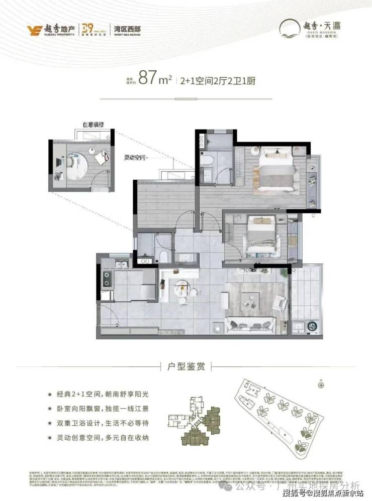 建面约87㎡2+1创意空间2卫,南向三开间,直揽江园,约94%使用率。
