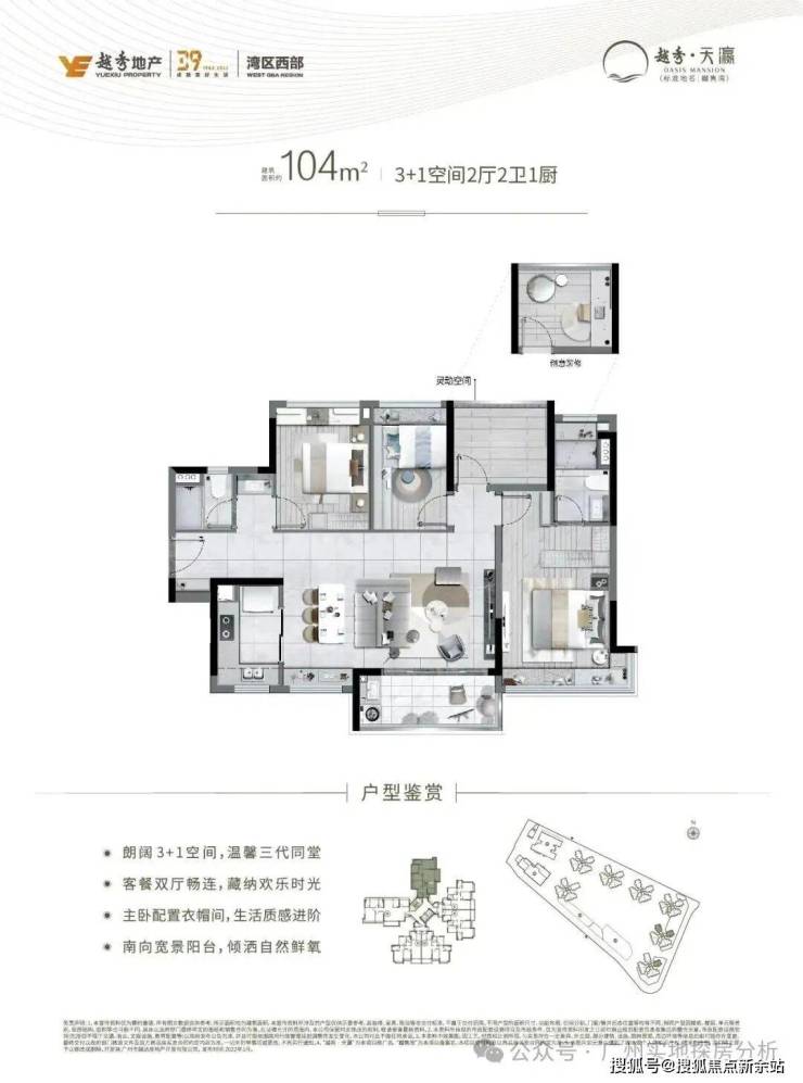 建面约104㎡3+1创意空间2卫,南向4.5米开间,约96%使用率,约6米超宽横厅,揽江园景观面