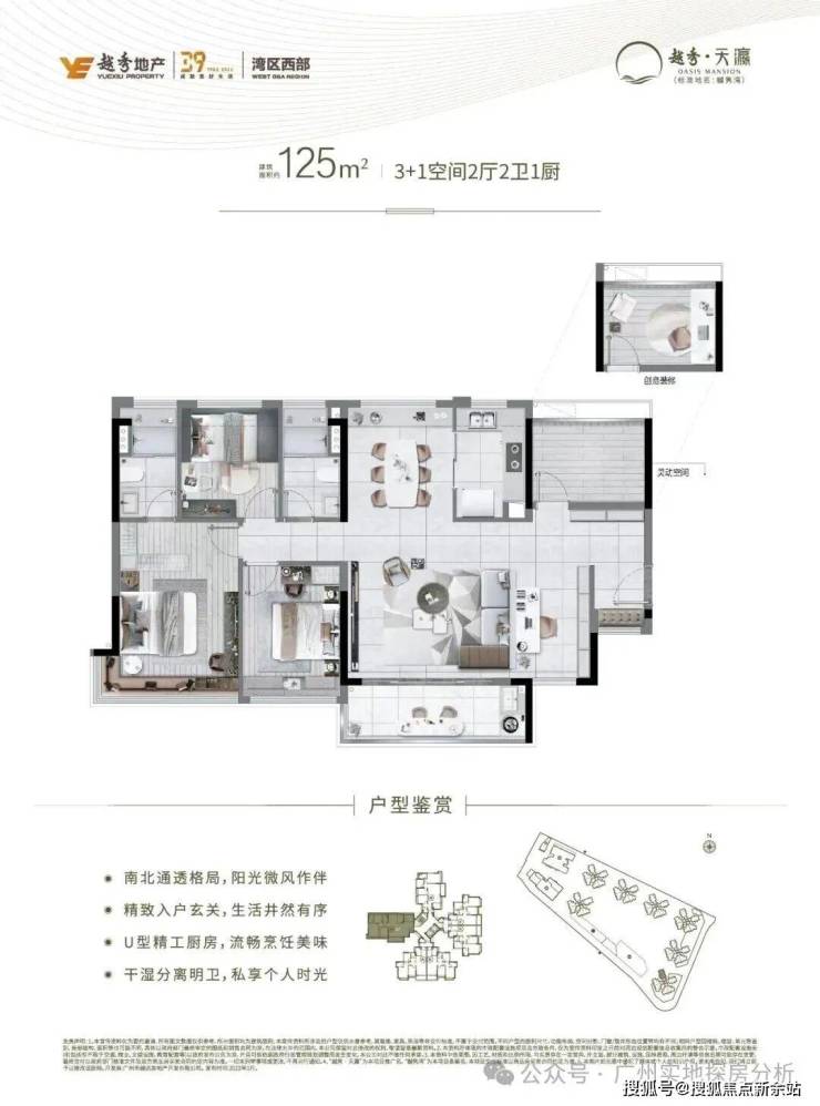 建面约125㎡3+1创意空间2卫,南向4.5开间,15.3米阔绰采光面,约98%使用率,近8米对流进深,约6.7米巨幕景观面,近5米景观阳台头排亲珠江,收藏江园,南北对流,进深约7米主卧套房,L型瞰景飘窗。