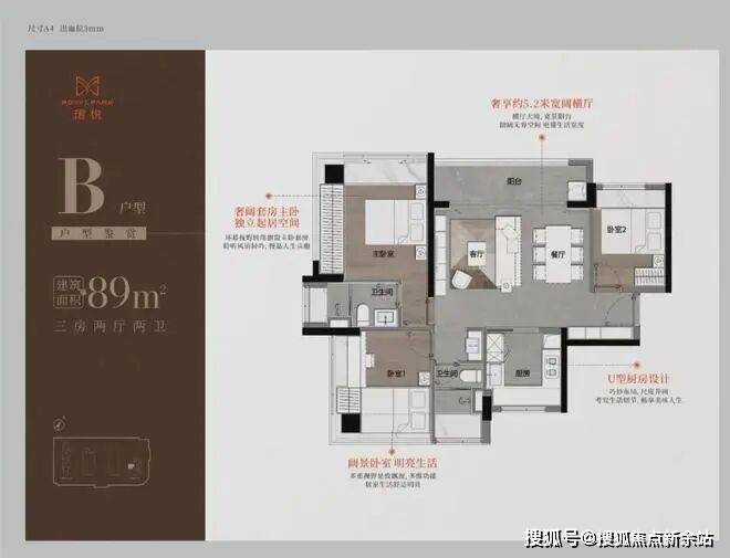 89㎡三房二卫A/B户型,位于1栋一单元,两开间阳台,主卧都有双面凸窗赠送。