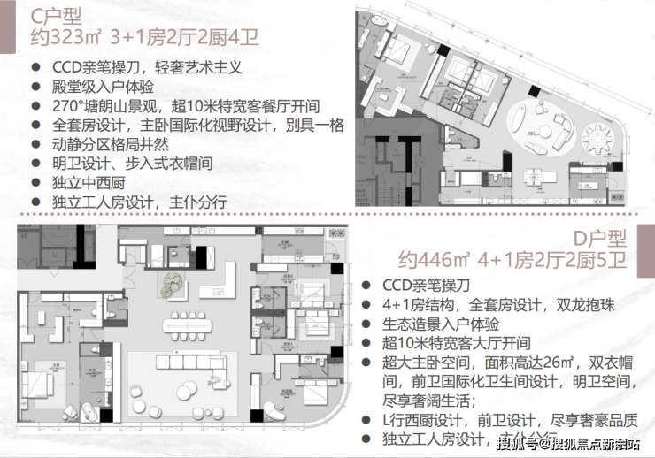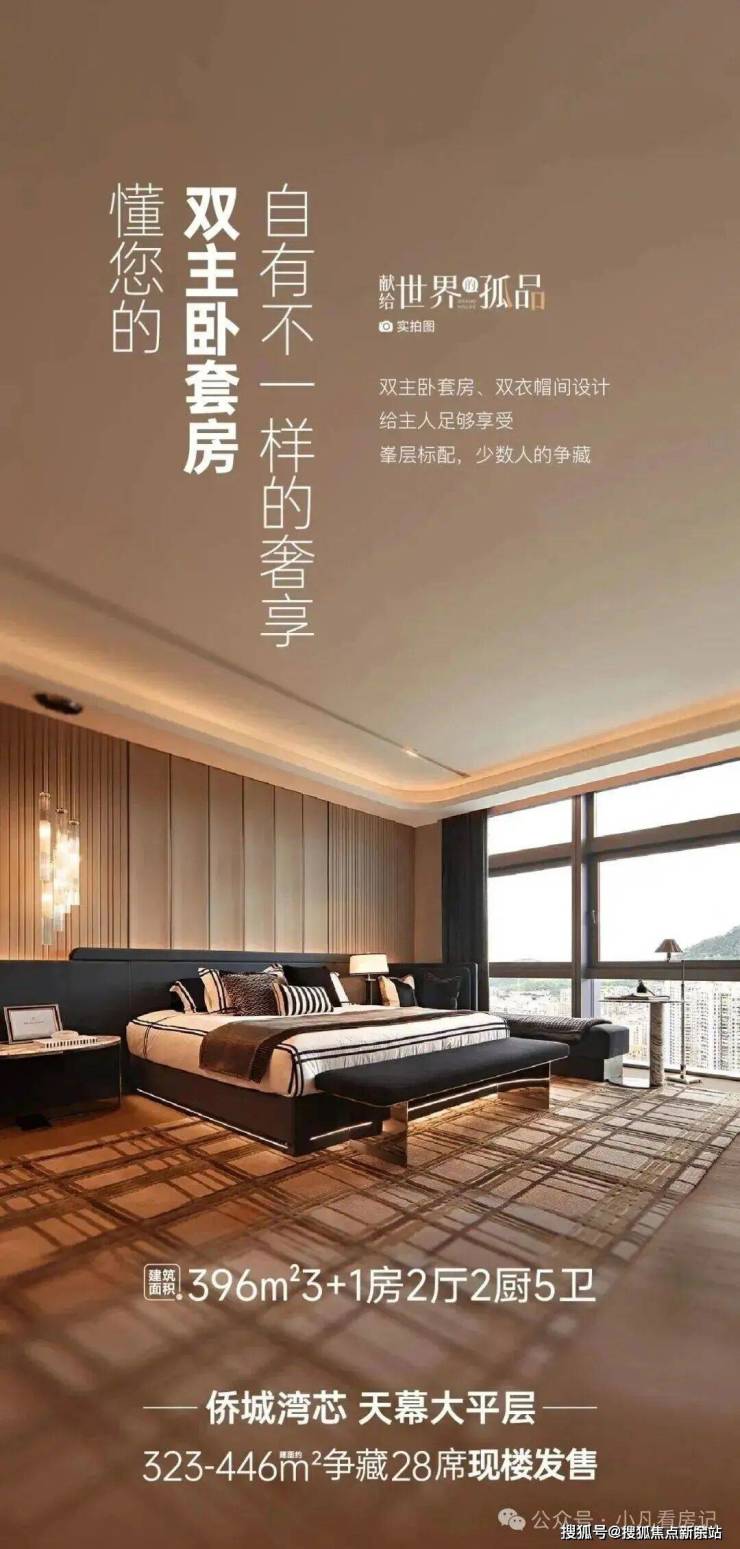 荟萃CCD、柏朗国际两大设计团队联袂匠造,以国际化视野,精研侨城湾芯云端新作,仅28席,位于建筑23-29层,全高区景观视野,建面约323-446㎡纯粹大户云端居所。4款室内设计风格独特,尺度阔绰,兼顾细致实用,畅享舒适空间。