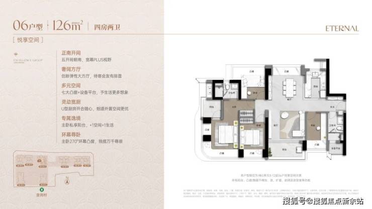 采用双龙抱珠格局,灵活适配成长型家庭。LDKB一体式布局,配备270°环幕主卧套房、U型厨房及七大飘窗,空间动静分离,实用且可变。