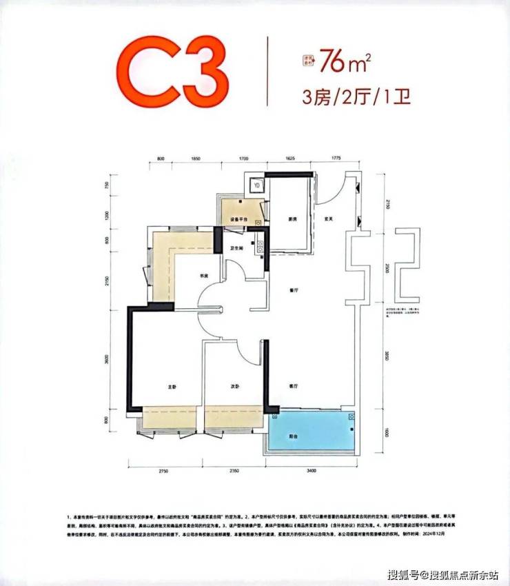 76㎡的3房2厅1卫,设计的是经典竖厅格局,客厅3.4米开间,LDKB一体化,S墙设计预留冰箱卡槽位,3个卧室分别做到了主卧10.99㎡/次卧7.3㎡/次卧5.91㎡(实测面积,去掉墙体),U型厨房,卫生间三段式分离,还带1个设备平台,赠送面积高达12.71㎡,实际得房率约97%(包含赠送),西南/东南或西北朝向。