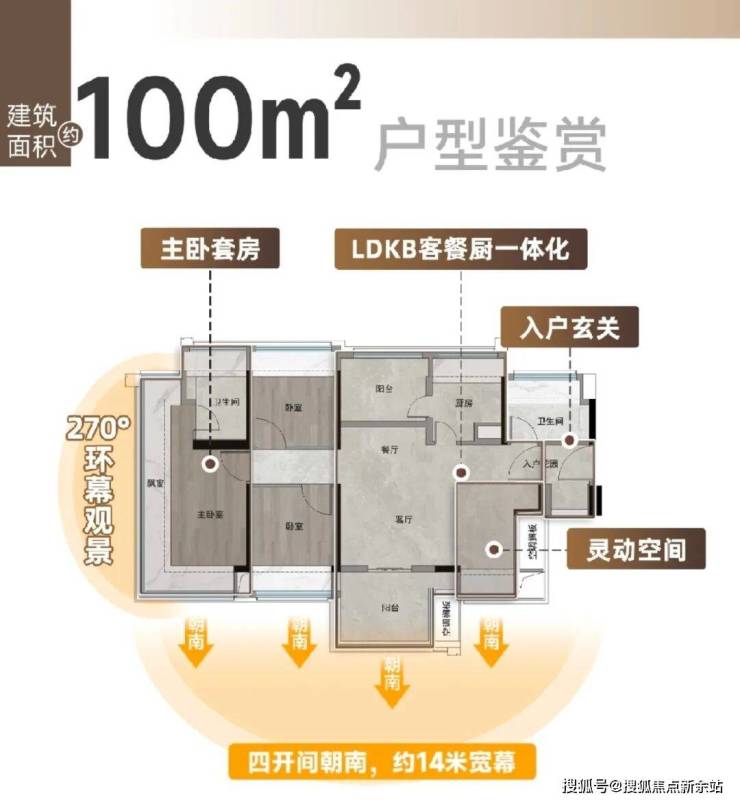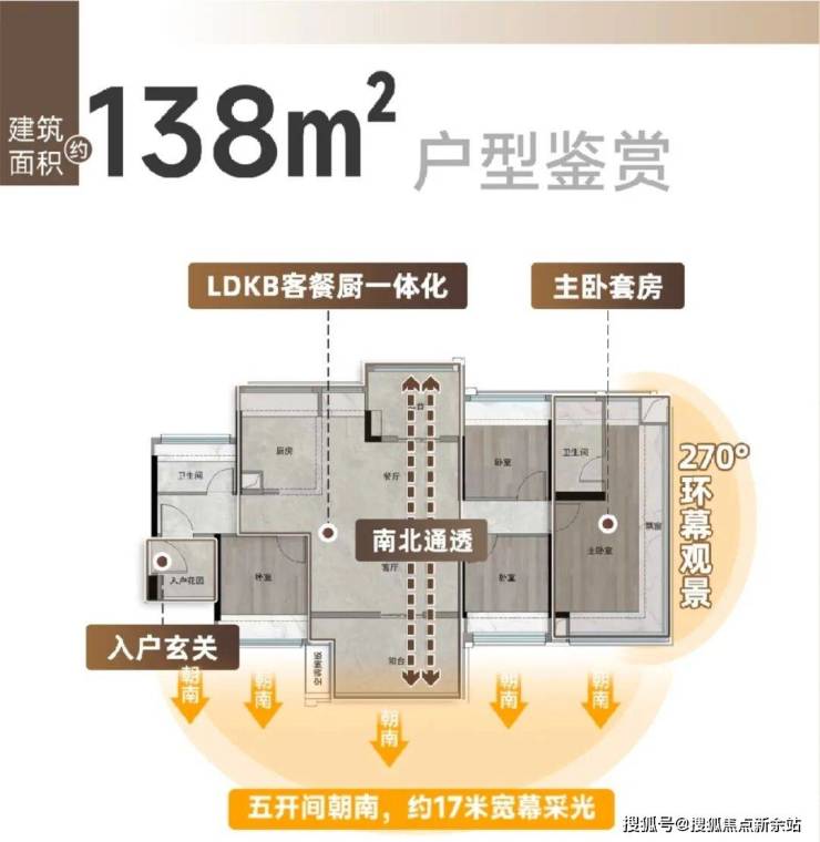 户型设计:主打建面约100-138㎡的四房户型,采用新规户型设计,使用率超100%,空间布局合理,注重通风、采光与景观资源利用。各户型均实现南北对流,部分户型设有双阳台,客厅与阳台一体化设计,增强空间通透感。