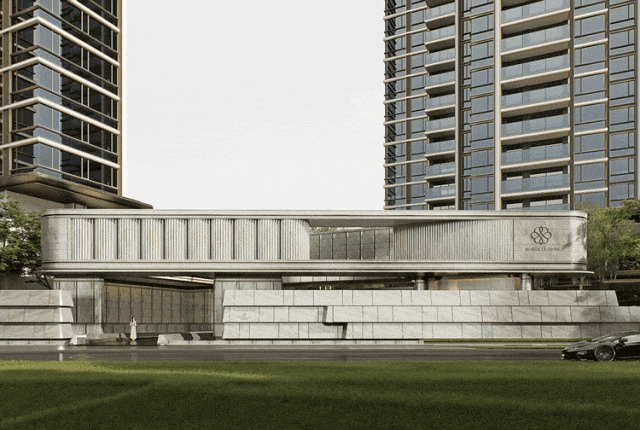 主入口以宝匣启玉为灵感,巧妙地运用弧形线条勾勒出云的灵动与写意,大面积铺设的皇家翠玉石材温润通透,静水前院倒映天光云影,瞬间便隔绝了外界的浮躁。